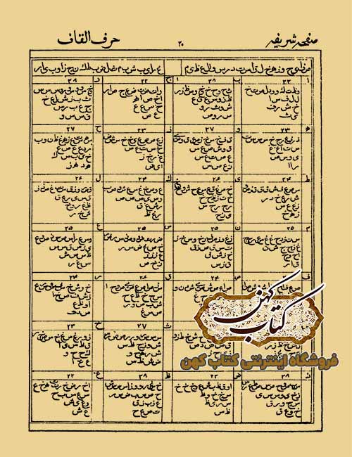 توضیحات : فهرست بخش هایی از عناوین مطالب کتاب : بیان الکیفیته لاستخراج بقاعده المداخل الاربعه جدول و حروف جفر قسم اول ابجد کبیر هذا دائره ابجد کبیر معروف هکذا صورته ابجد کبیر ابجد صغیر قاعده طالع ابجد وسیط ابجد طبیعیده اساس جدول های ابجد جدول دائره نسبت هکذا صورته هذا ابجد طبیعی هکذا صورته عناصر و افلاک و کواکب و بروج و منازل طریق استخراج زایجه نظریه ابجدی دایره ابجدی دایره اهطمی دایره ابتث دایره ایقمی